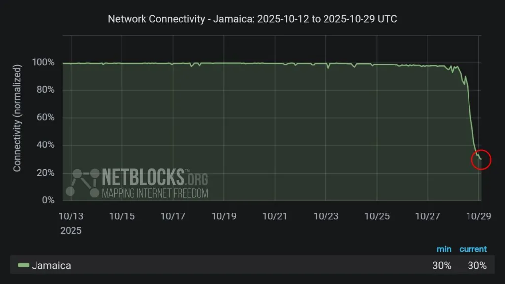 Según el servicio de monitoreo de fallas NetBlocks, el nivel de conexión a Internet en toda Jamaica cayó al 30%.
