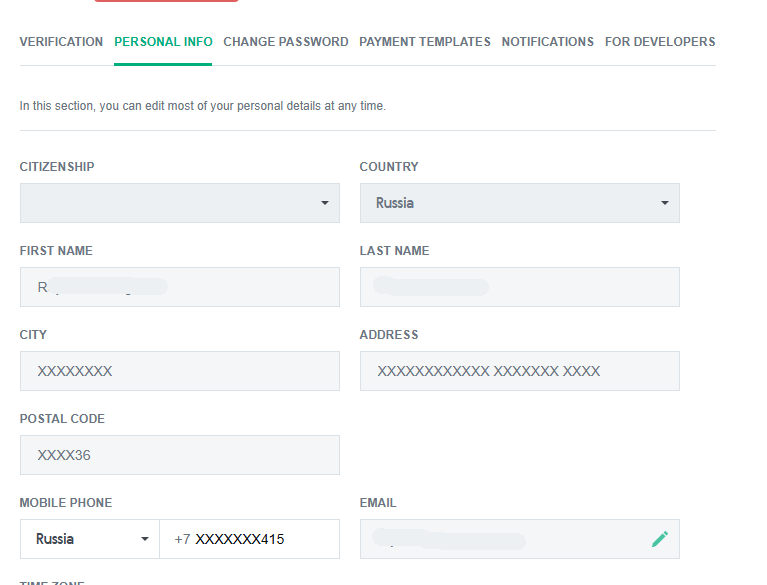 Luego en la sección de Información Personal (Personal Info) seleccionamos Rusia como pais de residencia para habilitar la opción de transferencias locales.