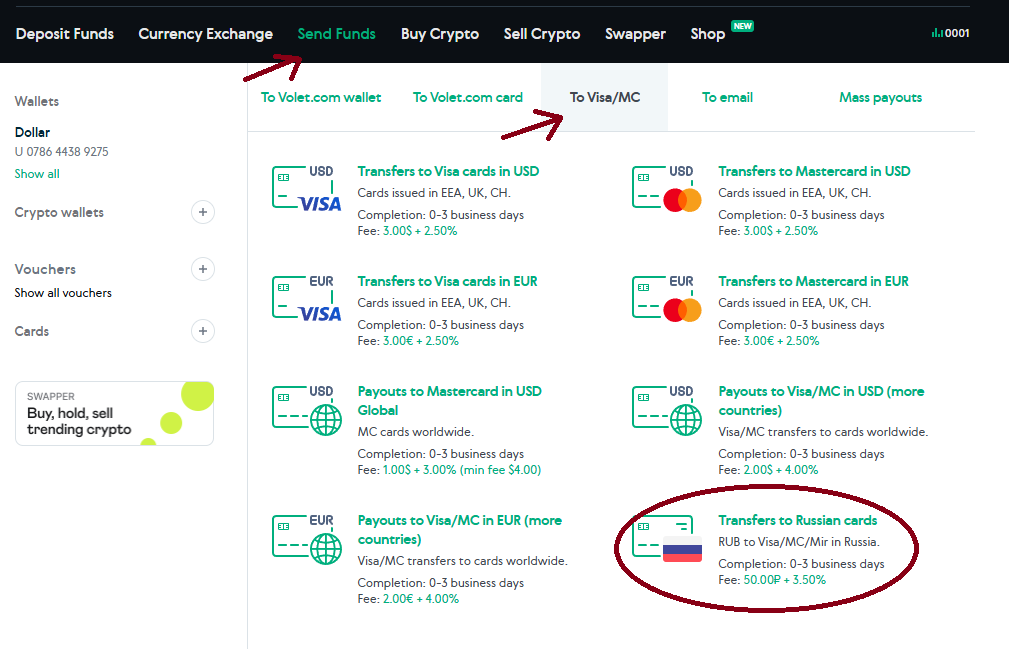 Dentro de Volet, entra a Send Funds → To Visa/MC -> Transfer to Russian cards