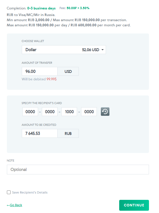 Una vez configurado, en el menu Send Funds -> To Visa/Mastercard, aparecerá la opción de enviar fondos directamente a tarjetas rusas.