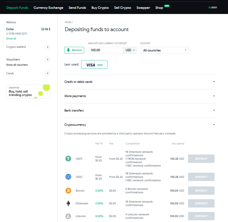 Volet permite varias formas de recarga, usaremos el método de criptomonedas.
